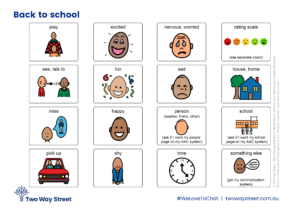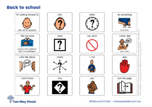 Use the example boards above in combination with your child’s speech, sign and/or augmentative and alternative communication system. We could make you a special board with a lot more vocabulary, but we think these conversations are a great opportunity to familiarise yourself with your child’s system and add in any extra vocabulary they might need for school. If you find you are missing a lot of words, have a chat to your speech pathologist or AAC support person to problem solve ideas.